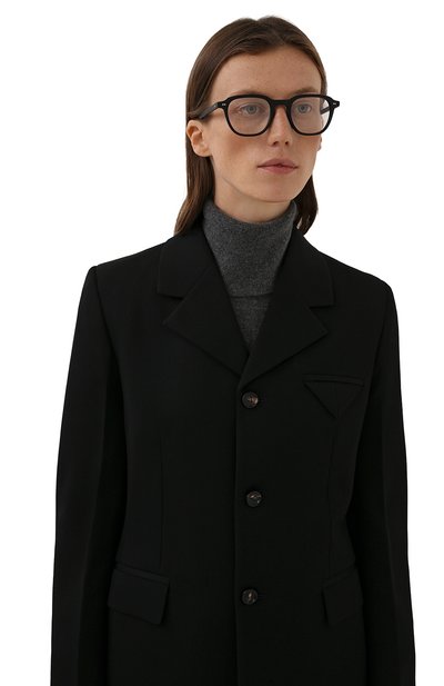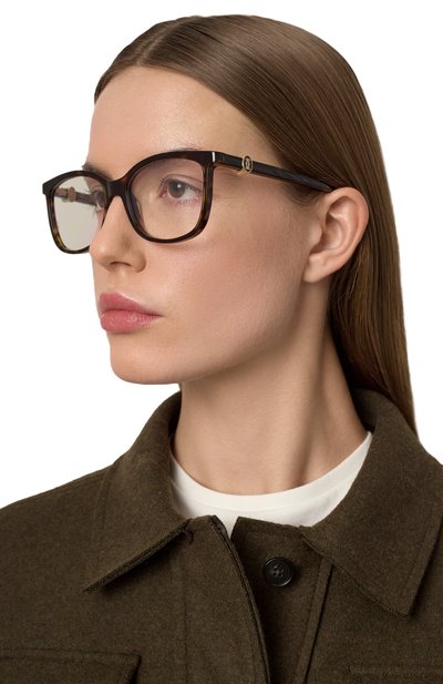 Оправу с фирменными Т-образными вставками на дужках и по краям ободов формы cat eye изготовили из глянцевого ацетата черепаховой расцветки. Линзы с покрытием blue block блокируют лучи синего спектра.