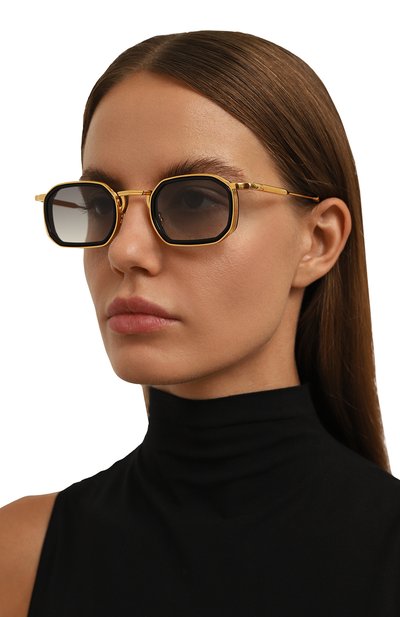 Солнцезащитных очки изготовили из металла с покрытием 22-каратным золотом Workman слоем около 5 мкм. Аксессуар с ювелирным штампом на внутренней стороне дужки дополнили заушниками из ацетата в тон градиентным линзам.