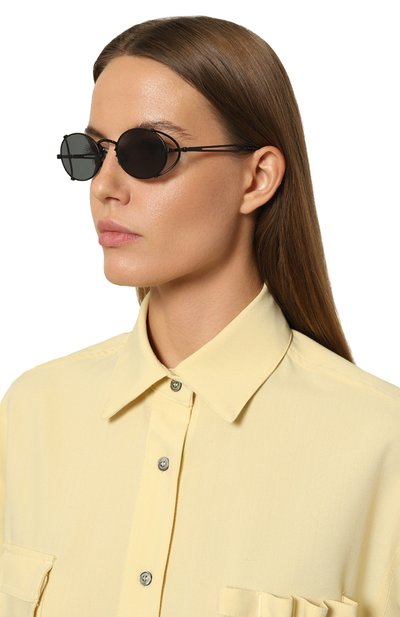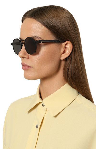 Солнцезащитные очки из нержавеющей стали и мельхиора подходят и мужчине, и женщине. Аксессуар с двойным мостом и заушниками из ацетата Mazzucchelli дополнили регулируемой винтовой резьбой. Линзы с УФ-фильтром и защитой от бликов не снижают контрастность изображений.