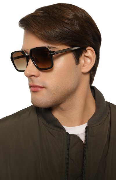 Солнцезащитные очки с фиксированными носоупорами выполнили из ацетата и дополнили крупными градиентными линзами. Одну из армированных дужек украсили эмблемой марки на заушнике.