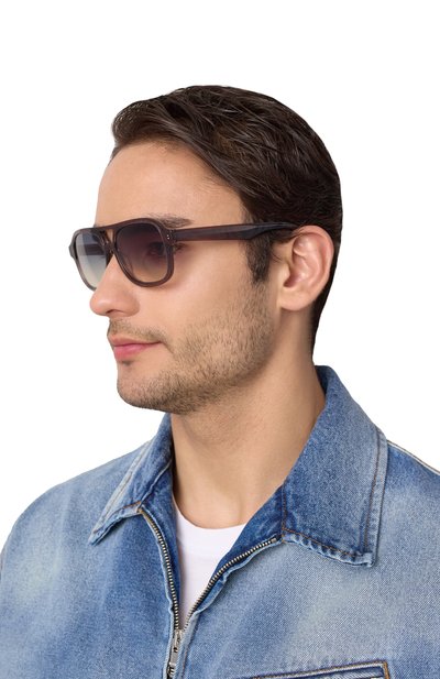 Для изготовления солнцезащитных очков использовали полупрозрачный ацетат, а двойной мост и стержень у армированных дужек выполнили из металла. Заушники дополнили вставкой с эмблемой бренда.
