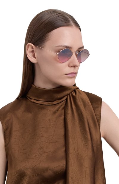 Солнцезащитные очки Metal Pegaso из золотистого металла украсили рельефной эмблемой, прикрывающей шарниры. Квадратный аксессуар с подвижными носоупорами и прозрачными ацетатными заушниками на тонких дужках оснастили тонированными градиентными линзами.