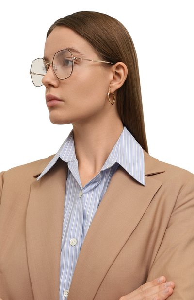 Тонкую круглую оправу с пружинным механизмом Flex на шарнирах узких брендированных дужек выполнили из металла. Аксессуар дополнили контрастными заушниками с наконечниками фирменного алого оттенка.