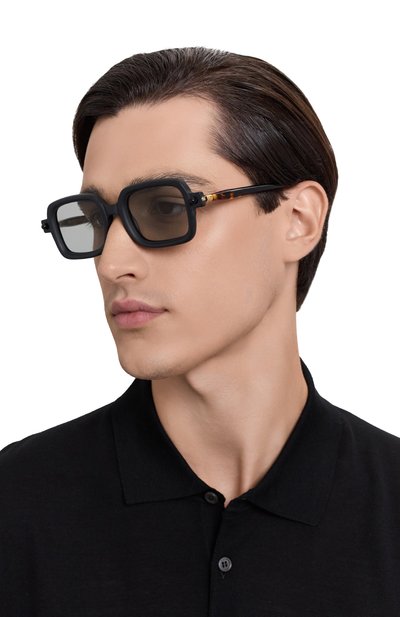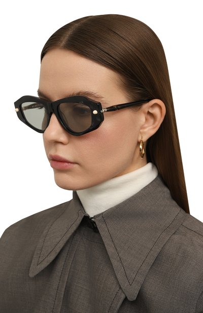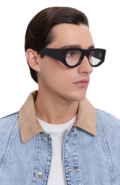Оправу авиаторов с прозрачными линзами изготовили из вторичного ацетата Eastman Acetate Renew. В двойной мост аксессуара вписали треугольный вырез, которому вторит миниатюрная контрастная эмблема на брендированных дужках.