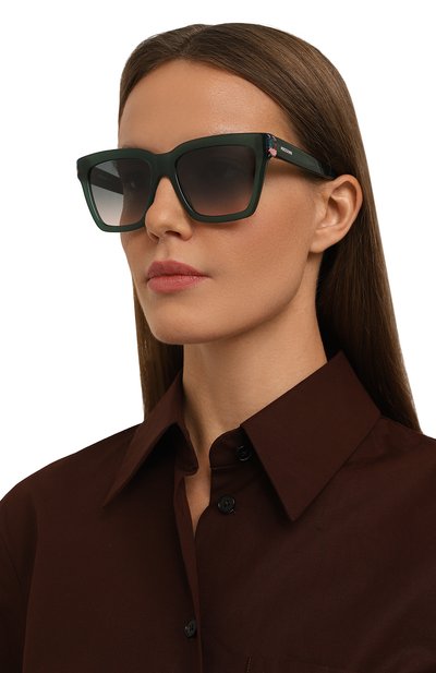 Очки с оправой из зеленого ацетата украшены золотистой эмблемой Interlocking G на дужках. Градиентные серые линзы обеспечивают 100-процентную защиту глаз от ультрафиолетовых лучей.