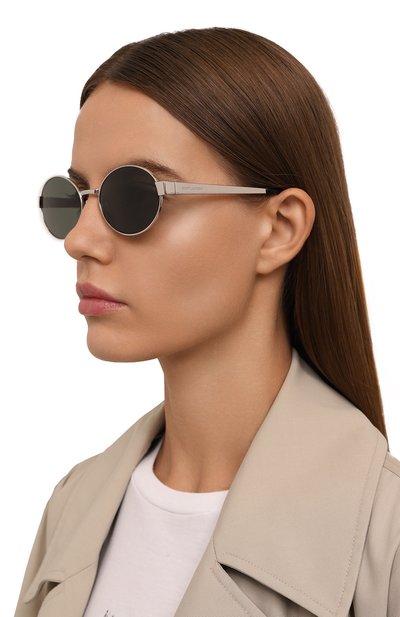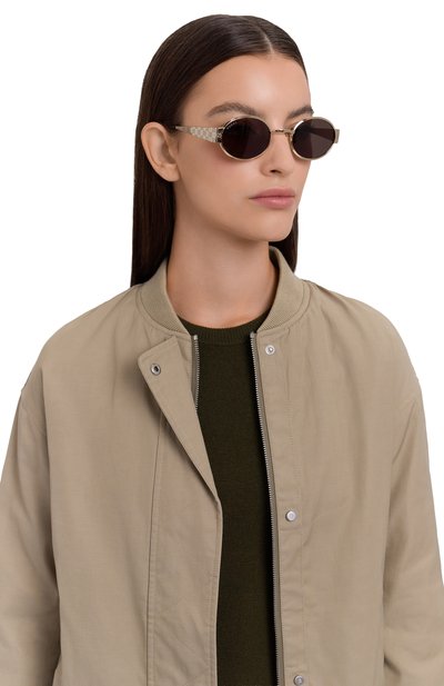 Очки с круглой оправой дополнены линзами с категорией затемнения 3, на 100% защищающими от УФ-лучей. Аксессуар изготовлен из металла с золотистым финишем. Дужки с заушниками из ацетата украсили тиснеными логотипами.