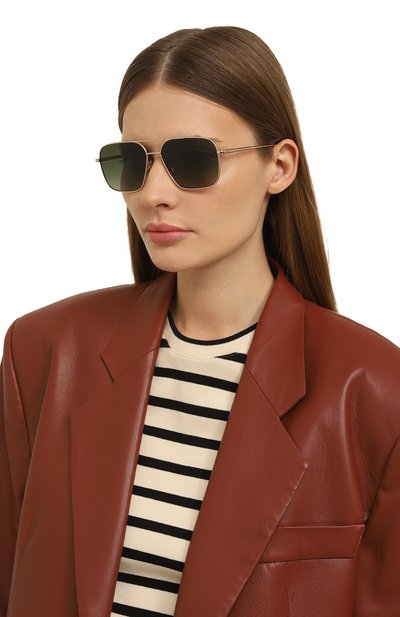 Безободковую оправу прямоугольных очков Astro выполнили из нержавеющей стали с золотистым финишем. Аксессуар с подвижными носоупорами оснастили зеркальными линзами с антибликовым покрытием, полностью блокирующими ультрафиолет.