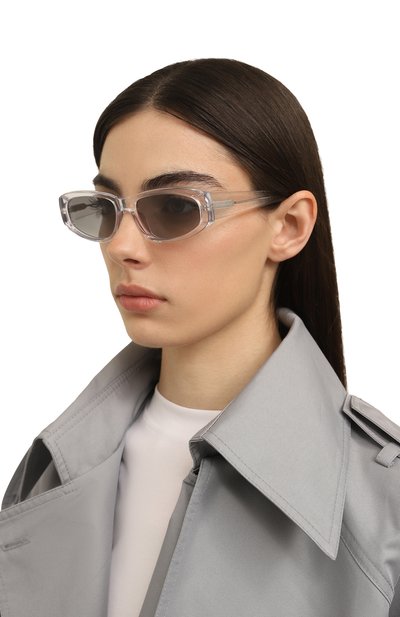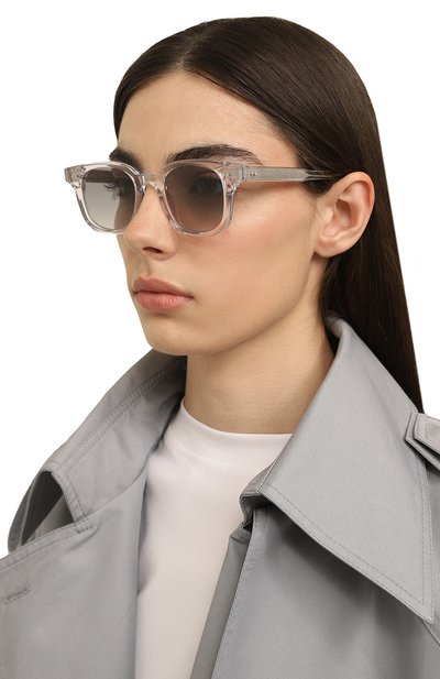 Солнцезащитные очки Kanda с градиентными линзами выполнили из прозрачного ацетата. Из такого же материала изготовили заушники на металлических тонких дужках с рифленым узором.