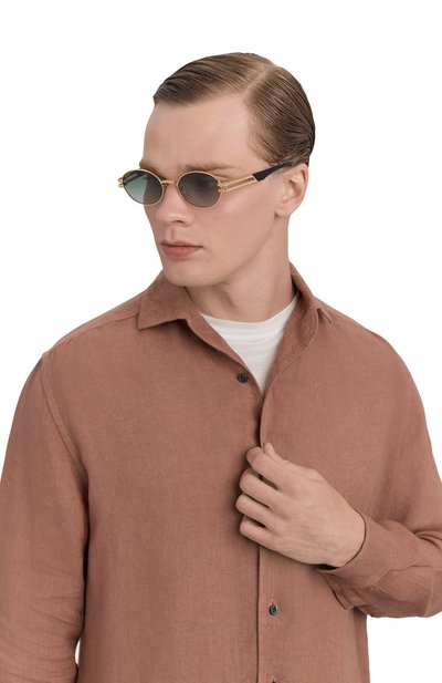 Роль акцента на солнцезащитных очках отдали геометричным дужкам из комбинации золотистого металла и полимера с черепаховым узором. Рядом с петлями выгравировали логотип марки. Аксессуар с овальными линзами и узкой оправой дополнили регулируемыми носоупорами.