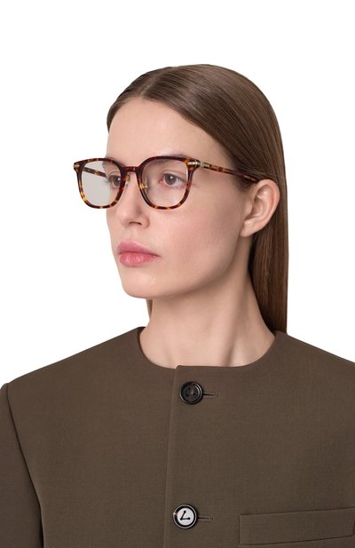 Оправу выполнили из ацетата с черепаховым узором. Дужки аксессуара из коллекции Signature C de Cartier украсили логотипом и вставками с фирменной эмблемой.