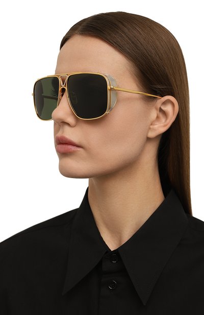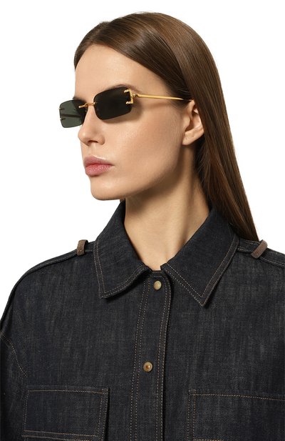 Безободковые солнцезащитные очки Magali выполнили из титана с покрытием из 22-каратного желтого золота. Аксессуар с креплениями-скобами на тонких дужках дополнили антибликовыми линзами Zeiss со 100% защитой от UVA- и UVB-лучей.