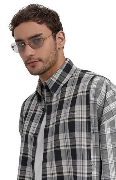 Поликарбонатные линзы солнцезащитных очков Aspen, представленных эксклюзивно в ЦУМе, украсили небольшой эмблемой. Аксессуар с контрастными заушниками и витыми узкими дужками выполнили из позолоченного металла.