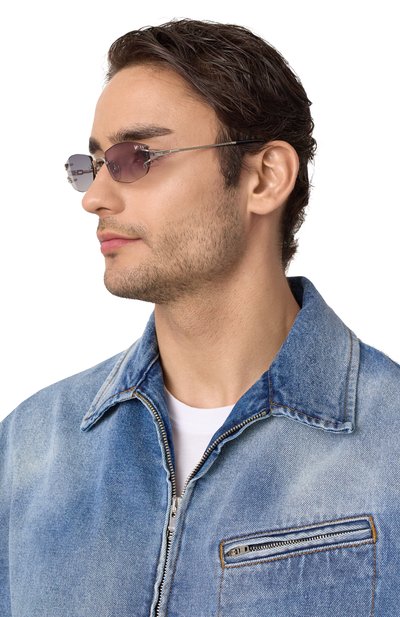 В коллекцию Detroit Player включили безободковые очки с градиентными линзами. Мост и фирменные витые дужки изготовили из металла с покрытием из 24-каратного белого золота. Аксессуар с регулируемыми носоупорами дополнили полимерными заушниками.