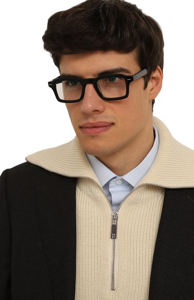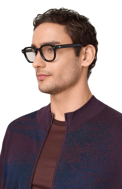 Оправа из глянцевого ацетата Mazzucchelli вошла в линию LT. Аксессуар с антибликовыми линзами украсили заклепками в местах креплений 5-цилиндровых шарниров OBE и фирменными накладками на заушниках.