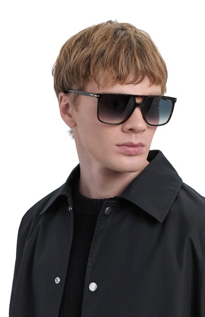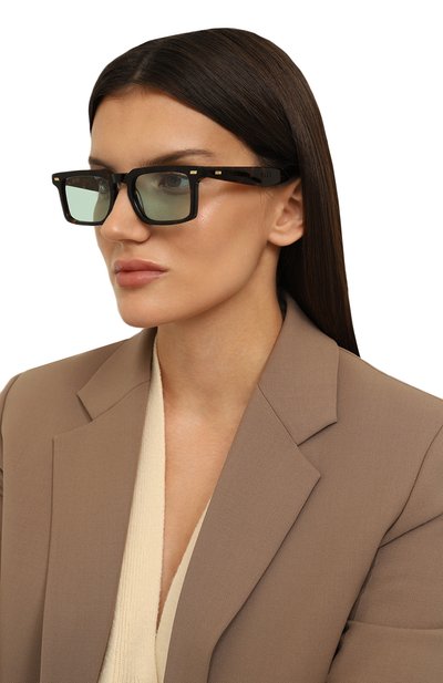 Солнцезащитные очки с двойным мостом выполнили из ацетата с черепаховым узором. Рамку модели со светлыми линзами украсили фигурными заклепками.