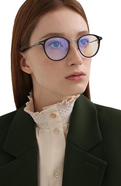 Оправу из матового полимера дополнили узкими металлическими дужками, подчеркнув принадлежность марке фирменными литерами T по бокам. Одну из линз аксессуара, блокирующих синие лучи, украсили логотипом марки.