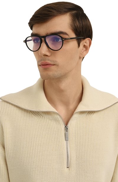 Оправа с овальными линзами, блокирующими синее излучение, подойдет для работы за компьютером. Аксессуар из металла частично покрыли эмалью, цвету которой вторят полимерные заушники.