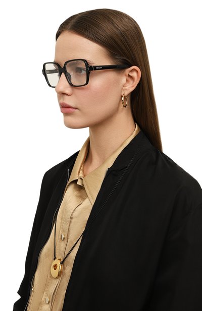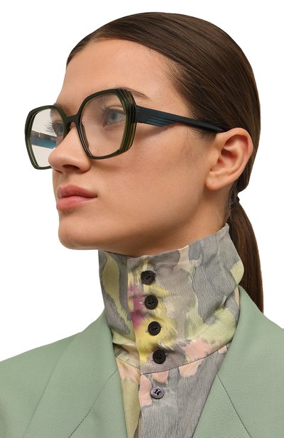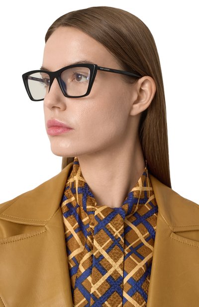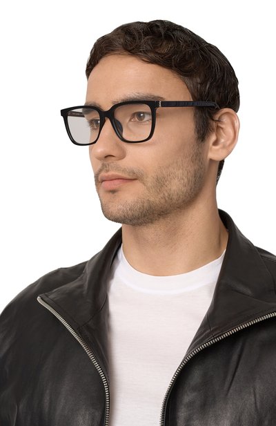 Для создания оправы с армированными дужками выбрали полупрозрачный ацетат. По бокам аксессуар с линзами blue block декорировали фирменными T-образными вставками, с которыми перекликаются брендированные пластины на заушниках.