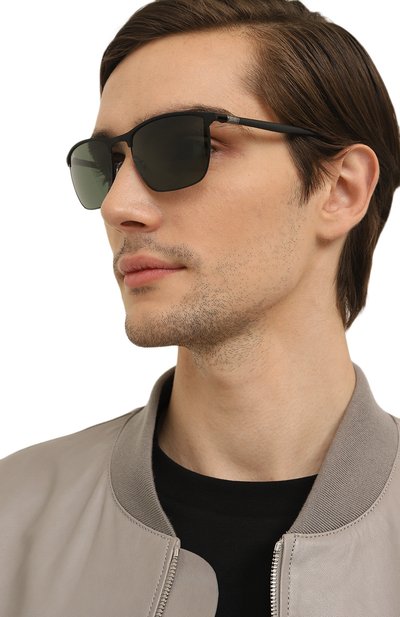 Солнцезащитные очки прямоугольной формы выполнили из полупрозрачного ацетата. Модель с мостом «панто» украсили логотипом бренда на армированных дужках.