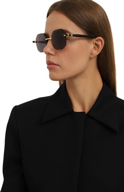 Безободковые солнцезащитные очки P63 с металлическим мостом и регулируемыми носоупорами дополнили поликарбонатными линзами, которые не пропускают 100% УФ-лучей. Брендированные дужки изготовили из ацетата.