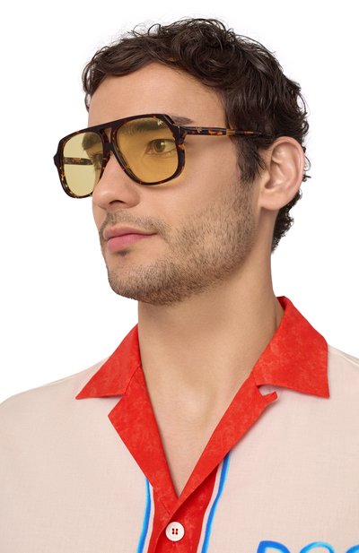 Солнцезащитные очки Dune с двойным мостом изготовили из ацетата черепаховой расцветки. Модель оснастили линзами, не пропускающими ультрафиолет.