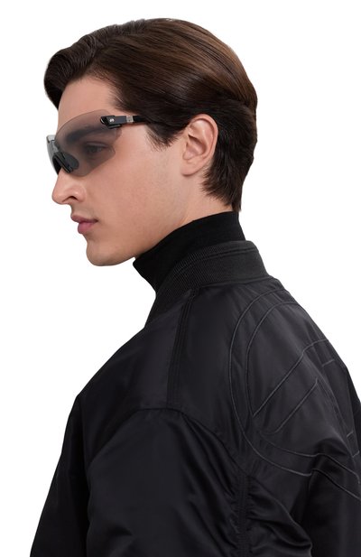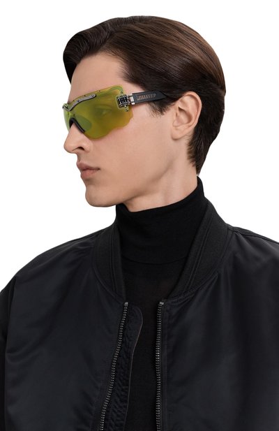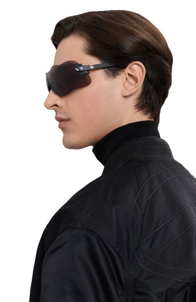 Безободковые солнцезащитные очки E50 изготовили из ацетата. Модель с заклепками на креплениях дужек дополнили фигурной монолинзой.