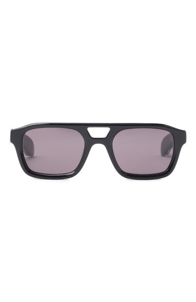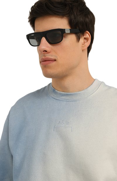 Оправу квадратных очков с темными нейлоновыми линзами, полностью блокирующими ультрафиолет, выполнили из глянцевого ацетата. Армированные дужки с логотипом декорировали на наконечниках металлическими накладками в виде знаков ого черепа.