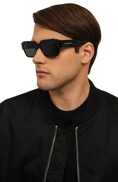 Оправу квадратных очков с темными нейлоновыми линзами, полностью блокирующими ультрафиолет, выполнили из глянцевого ацетата. Армированные дужки с логотипом декорировали на наконечниках металлическими накладками в виде знакового черепа.