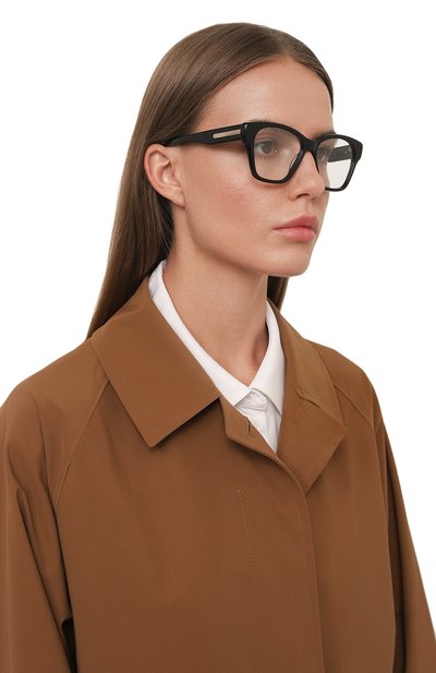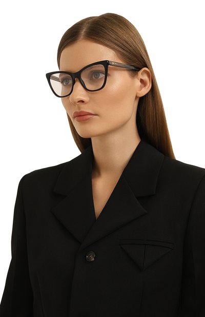 Для создания легкой прямоугольной оправы использовали прочный глянцевый ацетат. Одну из узких дужек украсили контрастным логотипом бренда.