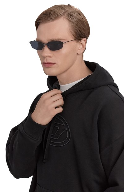 Солнцезащитные очки с градиентными нейлоновыми линзами, на 100% блокирующими ультрафиолет, выполнили из металла. Безободковый аксессуар с ацетатными заушниками украсили выгравированным логотипом на тонких дужках.