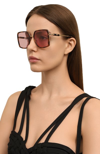 Безободковые солнцезащитные очки с градиентными линзами выполнили из металла. Одну из дужек модели с контрастными заушниками украсили сверху выгравированным логотипом бренда.