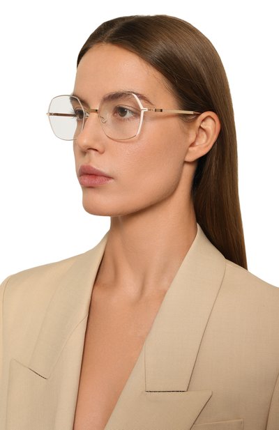 Безободковую оправу выполнили из металла с золотистым финишем. Носоупоры украсили выгравированной эмблемой GG, а тонкие дужки — вырезанным логотипом.