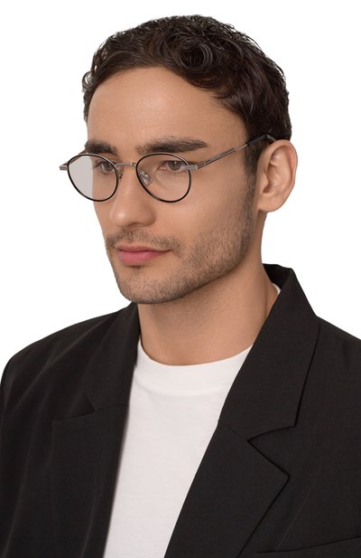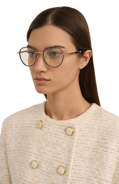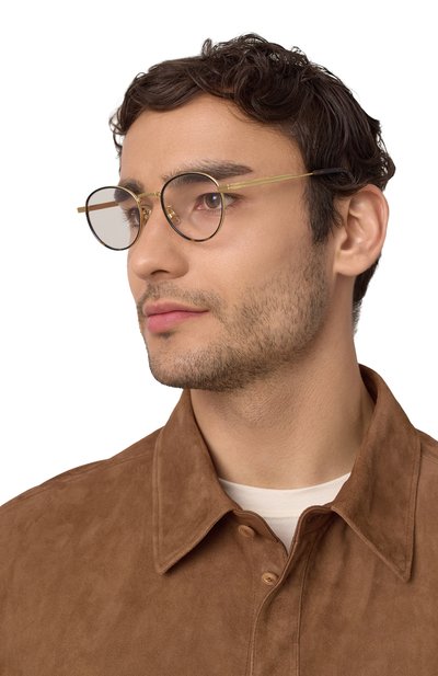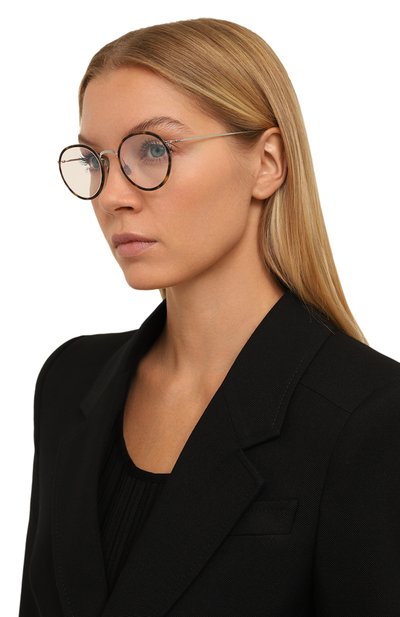 Для изготовления оправы использовали тонкий металл. Ободы продублировали ацетатом черепаховой расцветки, из которого также выполнили заушники. Крепление украсили накладкой с монограммой GG.