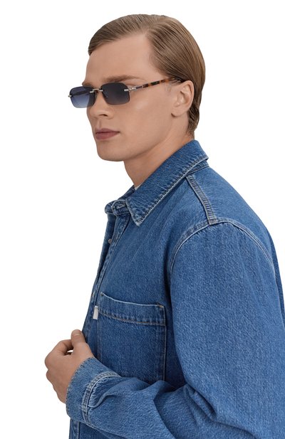Безободковые солнцезащитные очки с рифленой вставкой, окрашенной в цвета ленты Web, изготовили из золотистого металла, а дужки — из ацетата черепаховой расцветки. Аксессуар с подвижными носоупорами оснастили линзами, не пропускающими УФ-лучи.