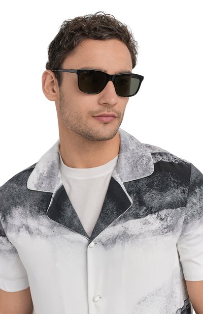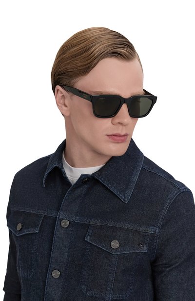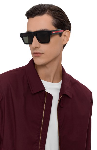 Квадратные солнцезащитные очки с дымчатыми линзами, блокирующими ультрафиолет, изготовили из ацетата. Дужки с рельефными металлическими логотипами выполнили в цветах знаковой ленты Web.
