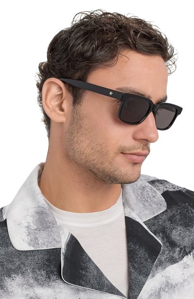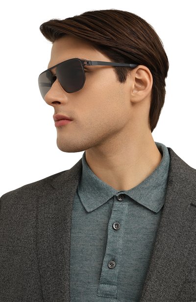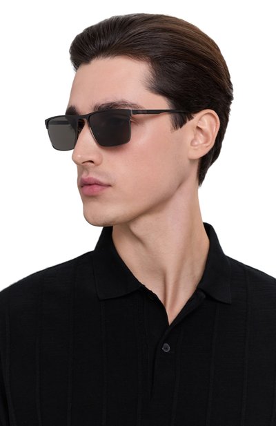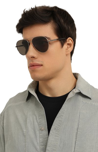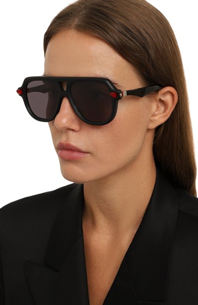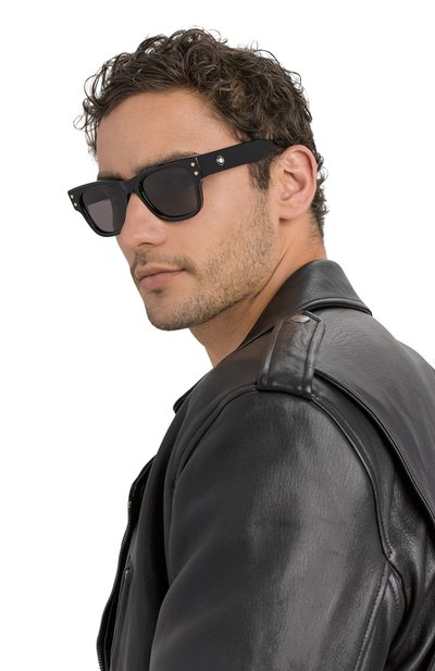 Очки с золотистой металлической рамкой выполнены из ацетата. Дужки украшены фирменными заклепками. Аксессуар дополнен поликарбонатными линзами с максимальным уровнем защиты от УФ-лучей.