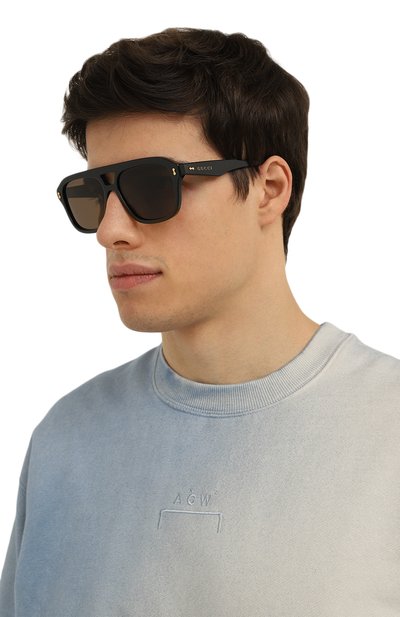 Солнцезащитные очки из отполированного ацетата оснастили линзами, на 100% блокирующими UVA- и UVB-лучи. Широкие армированные дужки аксессуара украсили фирменной эмблемой.
