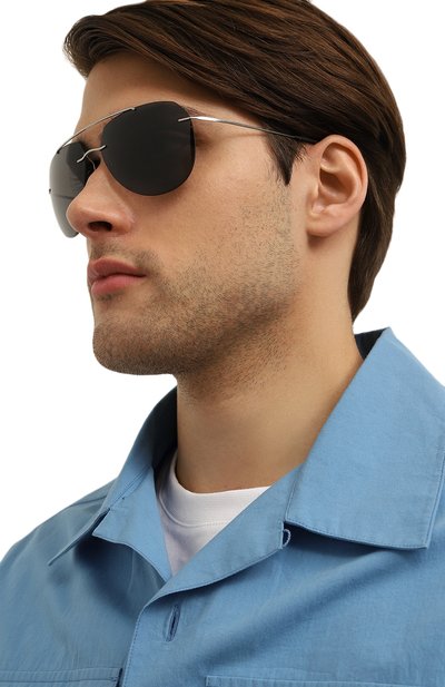 Оправа солнцезащитных очков изготовлена из серебристого металла. Тонкие дужки с флекс-шарнирами и ацетатными заушниками украшены эмблемами марки. Аксессуар дополнен поликарбонатными линзами с максимальным затемнением.