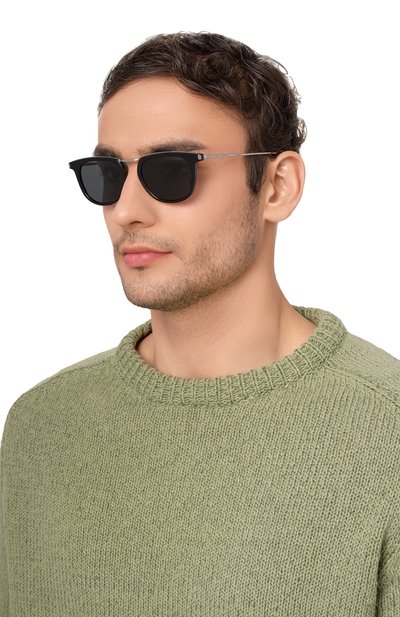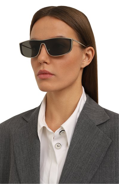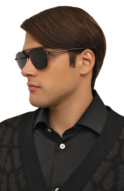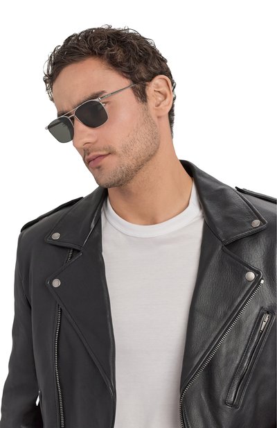Солнцезащитные очки с затемненными линзами выполнили из металла. Тонкие дужки модели украсили выгравированным логотипом бренда.