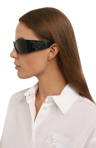 Солнцезащитные очки с полимерной оправой дополнили боковыми вставками, визуально увеличивающими линзы. Принадлежность аксессуара марке подчеркнули контрастными логотипами на широких дужках.