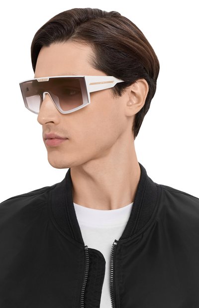 Безободковые солнцезащитные очки на гибких шарнирах выполнили из металла. Аксессуар с брендированными ацетатными дужками оснастили градиентной монолинзой, на 100% защищающей от UVA- и UVB-лучей.