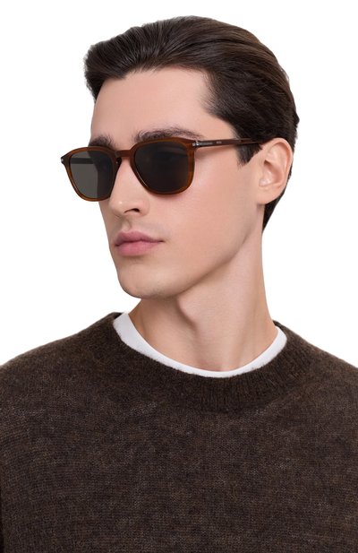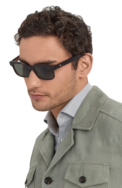 Солнцезащитные очки с рамкой из черепахового ацетата и однотонными дужками вошли в коллекцию Timeless Icons. Аксессуар с металлическими вставками по бокам и двойным мостом оснастили сильно затемненными линзами, на 100% блокирующими UVA- и UVB-лучи.