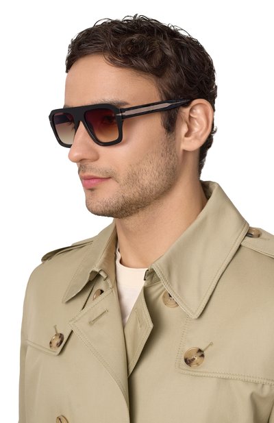 Cолнцезащитные очки выполнили из ацетата. Широкие дужки украсили вставками с узором, а одну из градиентных линз и правый заушник модели дополнили эмблемой марки.