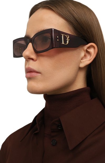 Квадратные солнцезащитные очки с градиентными линзами, блокирующими УФ-лучи, изготовили из тонкого металла. Аксессуар с накладкой в виде кленового листа на ацетатных заушниках украсили вставкой с крупным ажурным логотипом на дужках.
