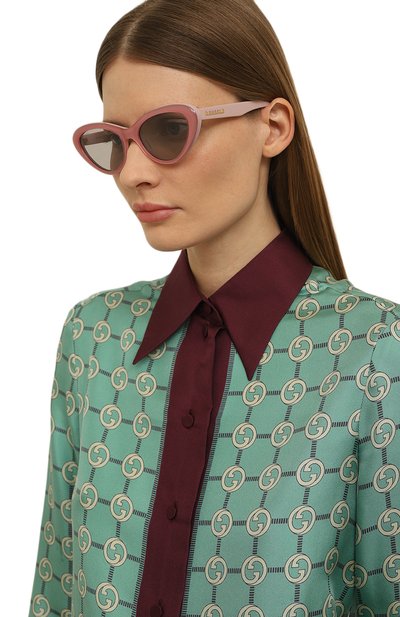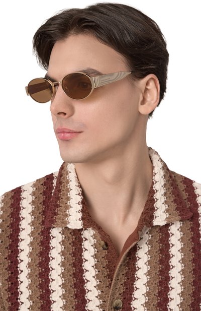 Солнцезащитные очки с овальными линзами выполнили из металла. Дужки модели, украшенные логотипом, выгравированным лазером, дополнили заушниками с черепаховым узором.