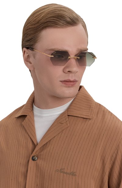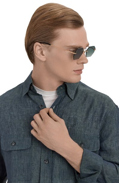 Солнцезащитные очки с трехшарнирными петлями и брендированными контрастными заушниками выполнили из металла. Безободковые градиентные линзы CR-39 на 100% блокируют ультрафиолет и не снижают четкость изображения.