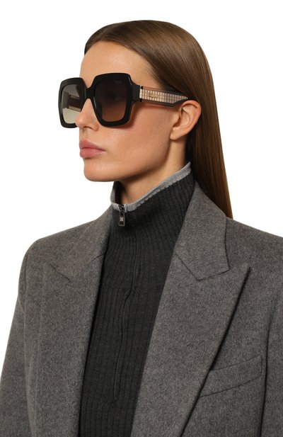 Оправу очков в пол-лица выполнили из глянцевого ацетата и легкого металла с золотистым финишем. Модель с градиентными линзами, полностью блокирующими ультрафиолет, декорировали рифлеными накладками по бокам и выгравированными логотипами на дужках.