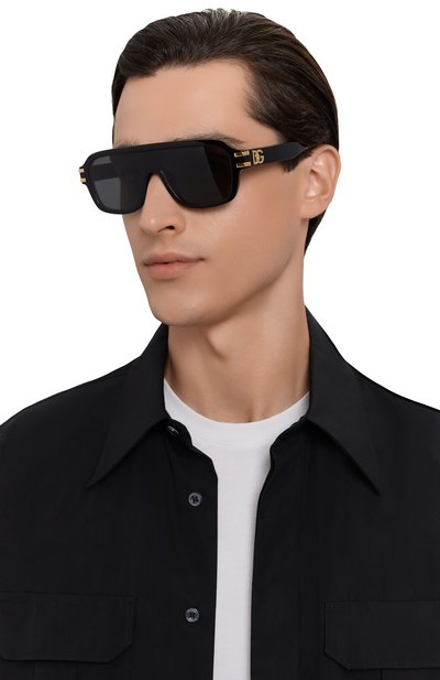 Солнцезащитные очки с зеркальной монолинзой вошли в коллекцию DG Griffe. Аксессуар с оправой из матового ацетата декорировали монограммой DG на дужках и полосками в тон сбоку.