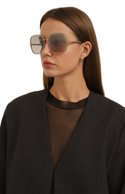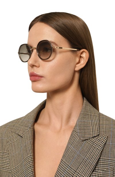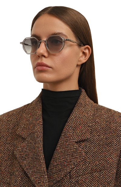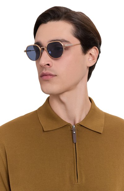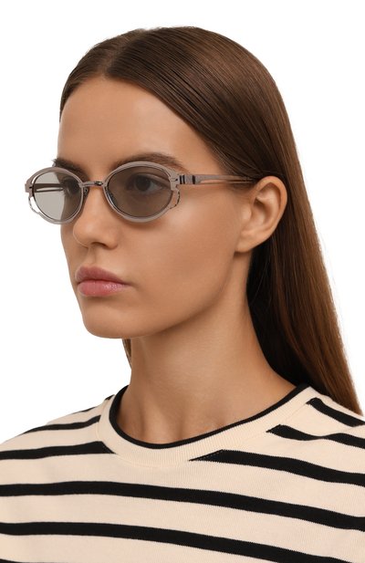 Солнцезащитные очки с тонированными линзами, не пропускающими ультрафиолет, изготовили из тонкого металла. Овальные ободы и брендированные дужки продублировали ацетатом.