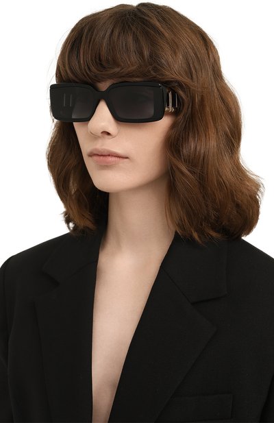 Солнцезащитные очки формы cat eye выполнили из ацетата. Дужки с креплениями в виде звеньев фирменной цепочки дополнили заушниками с наконечниками оттенка Tiffany blue. Градиентные линзы аксессуара не пропускают ультрафиолет.